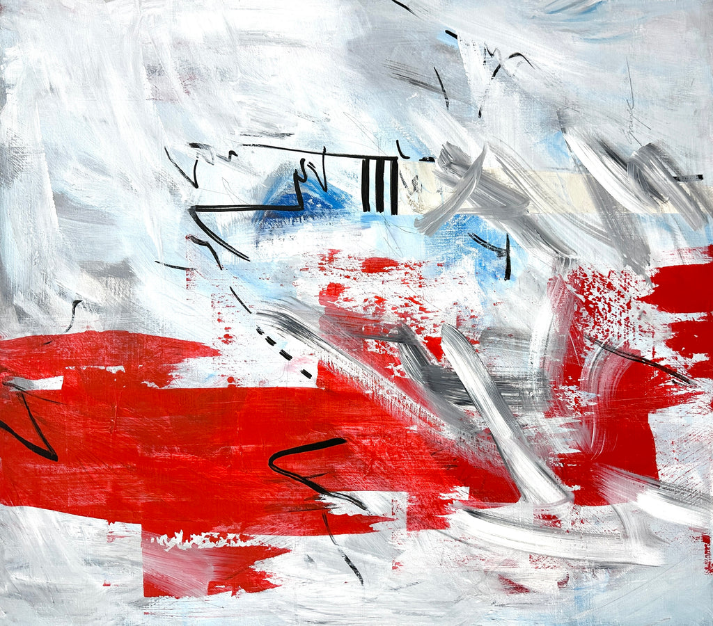 Bold reds seem to clash with white and gray in a dance of motion and tension—like a spirited discussion you can’t quite follow, but can’t walk away from either.